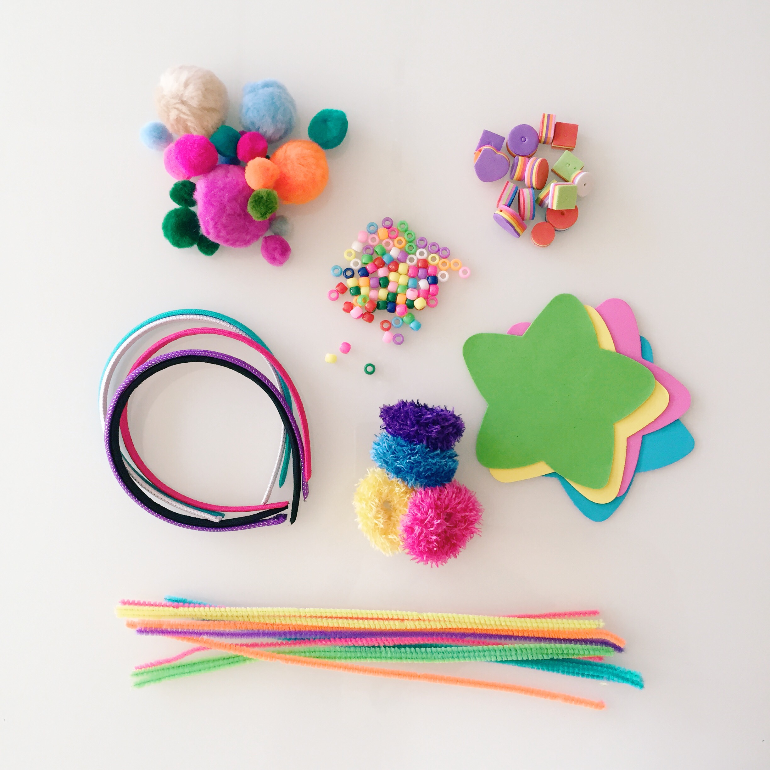 I decided on headbands and gathered some pom poms, beads, pipe cleaners, fuzzy hair ties and foam stars. Using a hole punch, I made a hole in the center of each star.